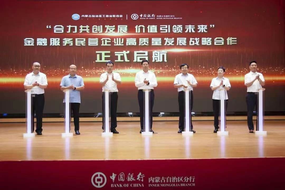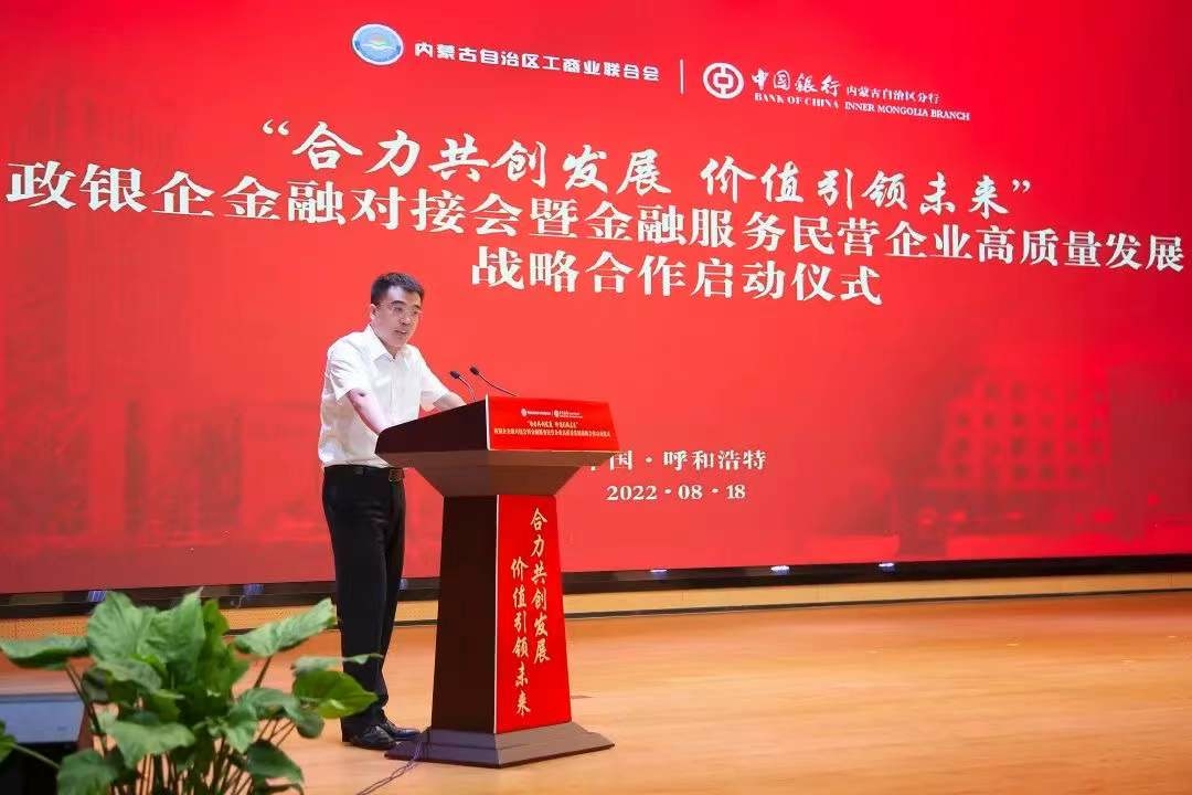 8月18日,中國銀行內蒙古自治區(qū)分行與內蒙古自治區(qū)工商業(yè)聯合會“合力共創(chuàng)發(fā)展 價值引領未來”政銀企金融對接會暨金融服務民營企業(yè)高質量發(fā)展戰(zhàn)略合作啟動儀式在呼和浩特舉行。自治區(qū)政協(xié)副主席、工商業(yè)聯合會主席安潤生,自治區(qū)工商業(yè)聯合會提名副主席溫殿龍,中國銀行內蒙古自治區(qū)分行黨委書記、行長胡文勇,中國銀行內蒙古自治區(qū)分行黨委委員、副行長雲雯妍出席活動。自治區(qū)工商業(yè)聯合會相關部門以及行業(yè)協(xié)會、商會、企業(yè)代表,中國銀行內蒙古自治區(qū)分行相關部門及直屬支行負責人參加活動。
