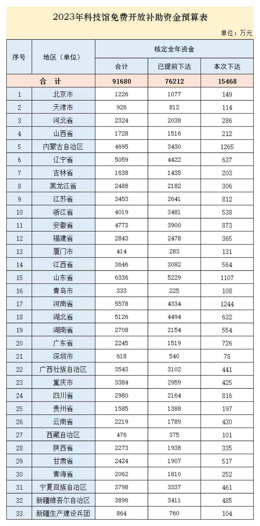人民網(wǎng)北京5月10日電 (記者任妍)記者從財政部獲悉,為保障免費開放科技館正常運轉(zhuǎn),經(jīng)研究,現(xiàn)下達(dá)2023年科技館免費開放補助資金預(yù)算,統(tǒng)籌用于各省(區(qū)、市)及新疆生產(chǎn)建設(shè)兵團2023年免費開放科技館門票減收補助、運行保障增量補助及展品更新補助等方面。數(shù)據(jù)顯示,全國核定預(yù)算91680萬元,提前下達(dá)76212萬元,此次下達(dá)15468萬元。