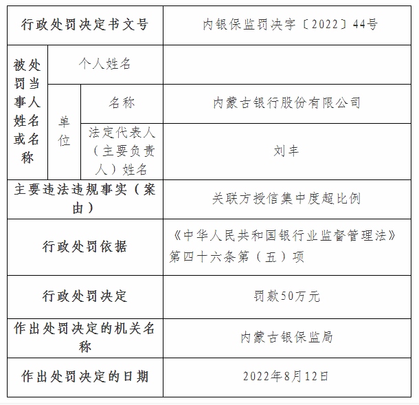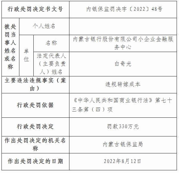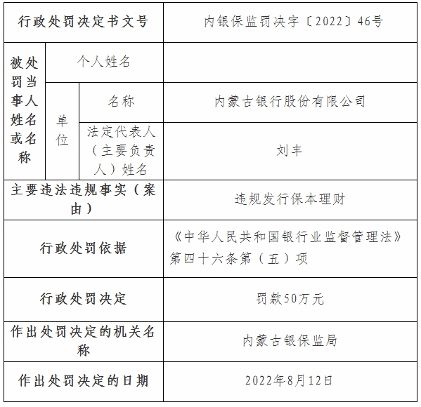 其中內(nèi)銀保監(jiān)罰決字〔2022〕44號(hào)、45號(hào)、46號(hào)行政處罰信息公開表顯示,內(nèi)蒙古銀行因關(guān)聯(lián)方授信集中度超比例、理財(cái)投資不審慎、違規(guī)發(fā)行保本理財(cái),分別被罰款50萬元、30萬元、50萬元;內(nèi)銀保監(jiān)罰決字〔2022〕47號(hào)行政處罰信息公開表顯示,內(nèi)蒙古銀行呼和浩特分行違規(guī)掩蓋資產(chǎn)質(zhì)量,被罰款50萬元;內(nèi)銀保監(jiān)罰決字〔2022〕48號(hào)行政處罰信息公開表顯示,內(nèi)蒙古銀行小企業(yè)金融服務(wù)中心因違規(guī)轉(zhuǎn)嫁成本,被罰款330萬元。