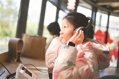 2024年11月24日,小朋友在江蘇省昆山市圖書館城市公園分館收聽“有聲森林”音頻。