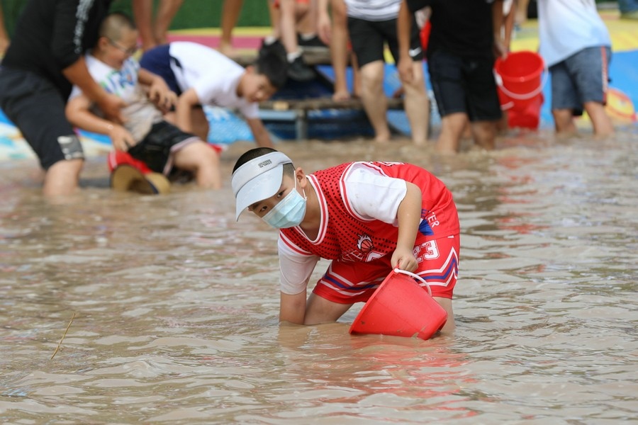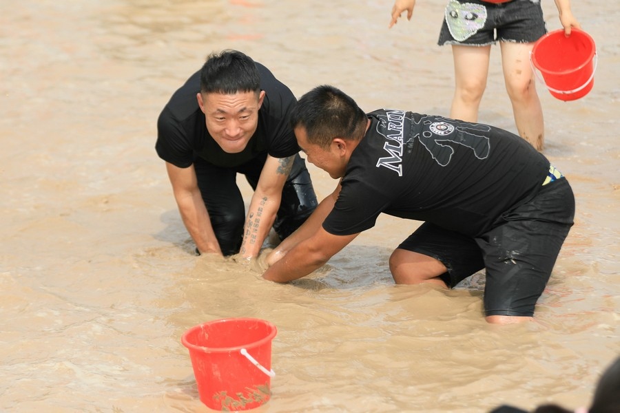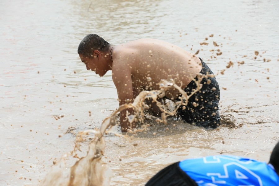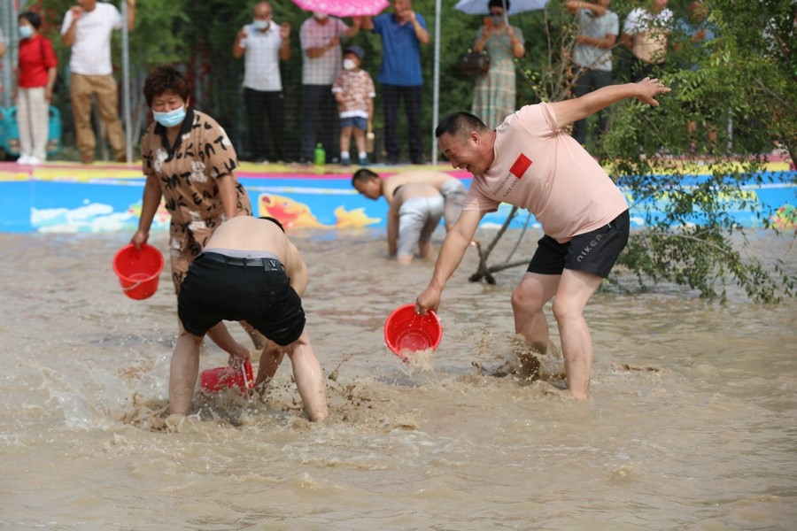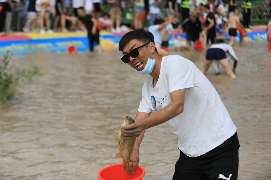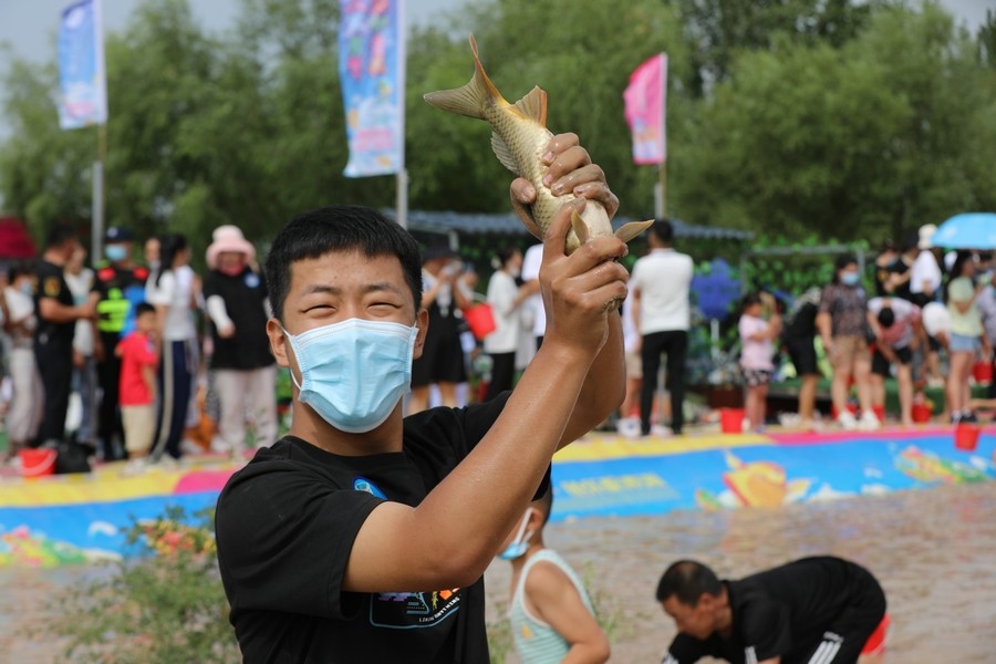 隨著主持人的一聲號令,來自呼和浩特市區(qū)和土默特左旗的眾多參與者,挽起褲管,光著腳丫,沖進(jìn)池塘,展開了一場摸魚大比拼。