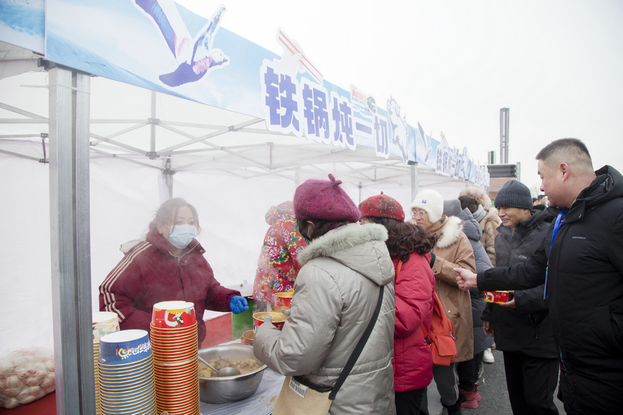 1月4日清晨,游客在房車營(yíng)地內(nèi)排隊(duì)領(lǐng)取鐵鍋燴菜