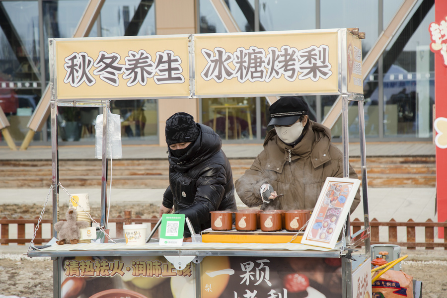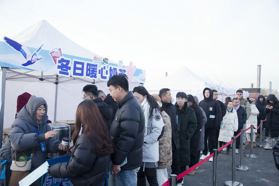 1月4日清晨,房車營(yíng)地內(nèi)的暖冬造趣節(jié)現(xiàn)場(chǎng)游客在排隊(duì)領(lǐng)取免費(fèi)奶茶