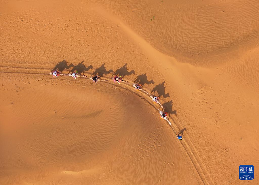 8月1日,游客在達拉特旗銀肯塔拉沙漠景區(qū)騎駱駝(無人機照片)。
