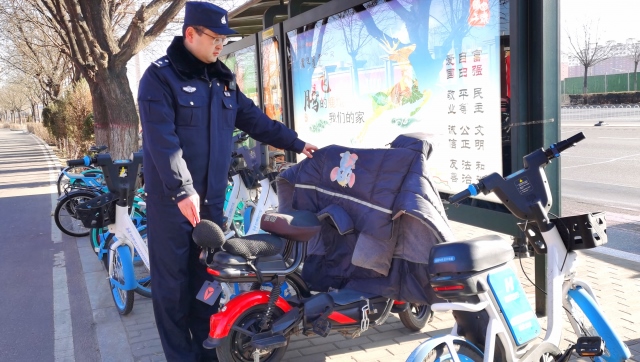 民警在公交車站牌附近實(shí)地調(diào)查走訪