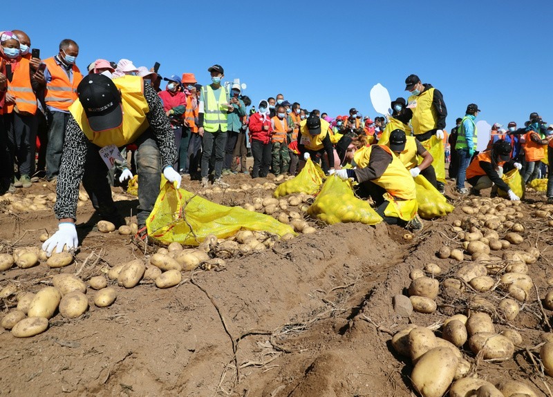 豐收節(jié)現(xiàn)場,還舉行了別開生面的土豆趣味運(yùn)動會,6支代表隊參加了比賽,裁判員以速度計時、數(shù)量稱重等方式來決定最后的勝負(fù),比賽過程熱火朝天,參賽者的臉上洋溢著喜悅的笑容。