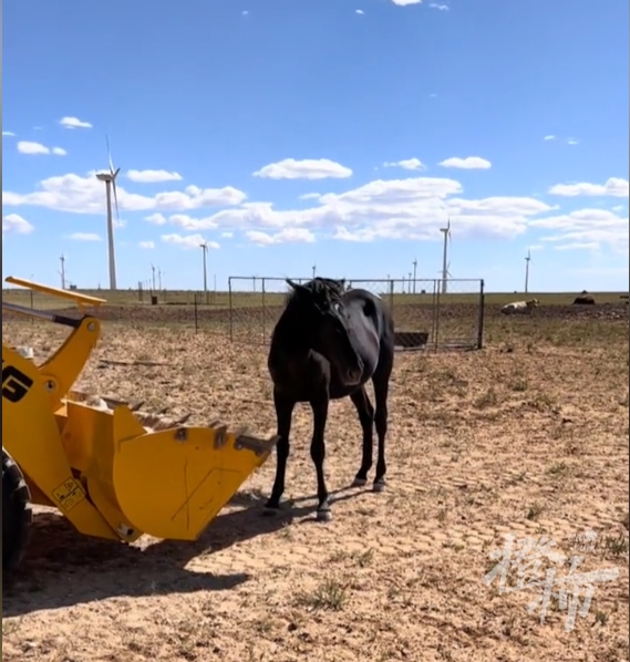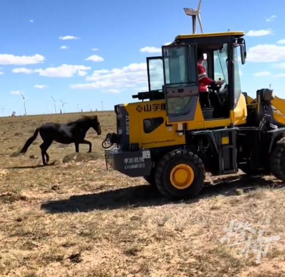 橙柿互動留意到,視頻內容顯示:一匹老馬躺在車斗里,車前車后,有兩匹馬兒在圍追這輛鏟車,甚至擋住車斗,鏟車被迫多次停下。