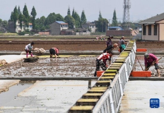 4月20日,在彭山區(qū)公義鎮(zhèn)的數(shù)智水稻示范基地,工人在秧盤智能傳輸帶上轉(zhuǎn)運育秧盤。