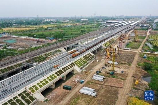 這是5月20日拍攝的滬寧沿江高鐵太倉(cāng)站施工現(xiàn)場(chǎng)(無(wú)人機(jī)照片)。