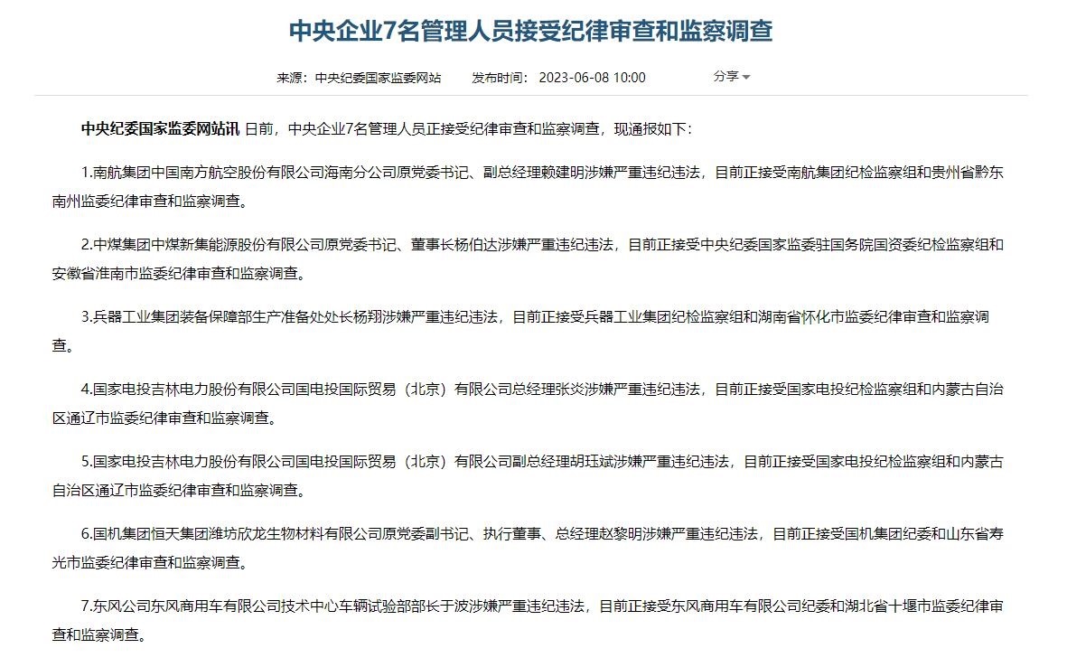·中央企業(yè)7名管理人員接受紀(jì)律審查和監(jiān)察調(diào)查。