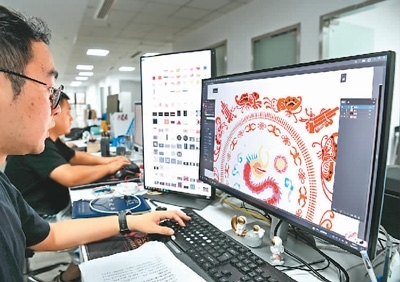 多彩貴州文化數(shù)據(jù)平臺有限公司的設(shè)計師在電腦上做苗繡矢量化提取。
