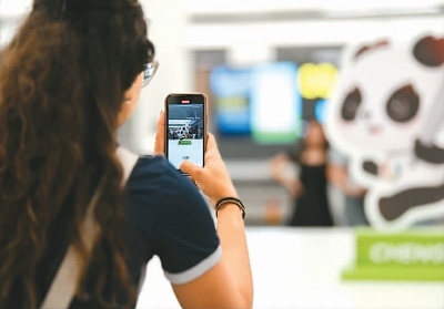 成都天府國際機(jī)場內(nèi),抵蓉的巴西代表團(tuán)成員在等候行李時(shí)拍攝機(jī)場內(nèi)的大運(yùn)會(huì)吉祥物“蓉寶”裝飾。新華社記者 胥冰潔攝