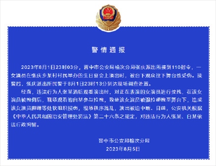 ·山西晉中警方通報(bào)女演員被觀眾拉下舞臺(tái)致傷:兩人被行拘。