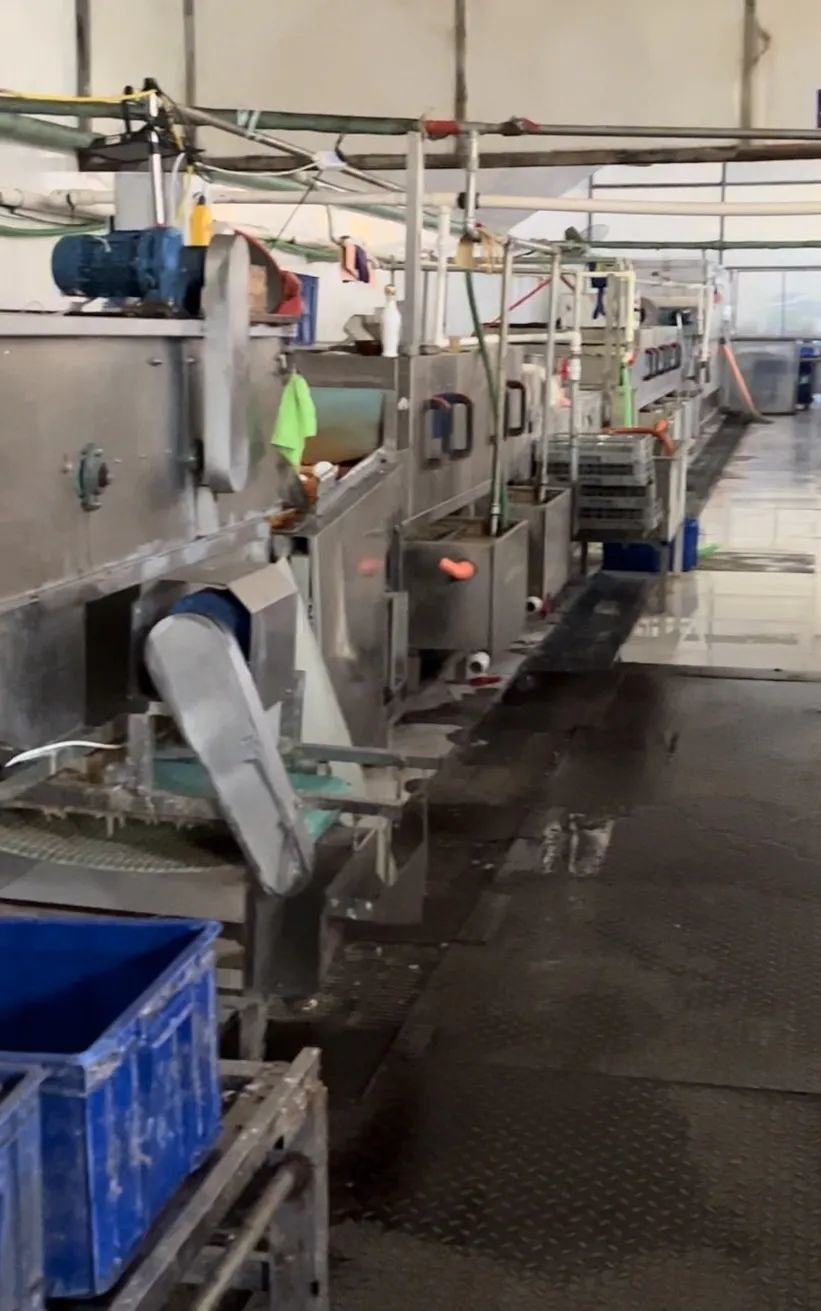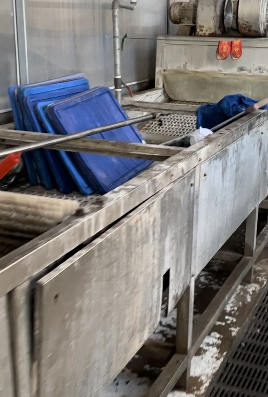 進(jìn)入廠房首先看到的就是一整車餐余垃圾,靠墻放置著多箱已使用后的餐具,地面上存有積水,機(jī)器處于停止?fàn)顟B(tài),工作臺(tái)上留有殘余垃圾,還有鞋墊在上面晾曬。在此期間有多輛小型貨車來裝卸餐具。