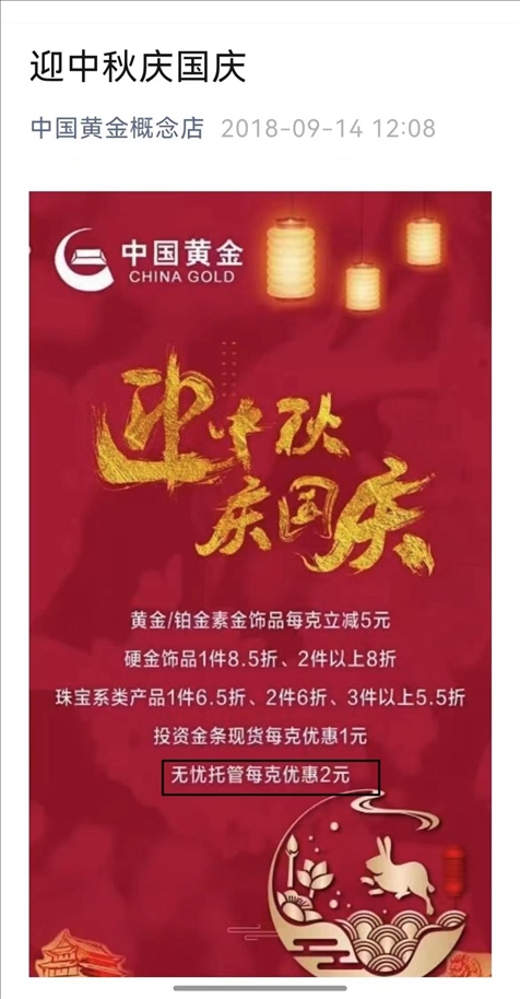 2018年,涉事門店的公眾號仍在宣傳無憂托管業(yè)務(wù),消費(fèi)者質(zhì)疑中國黃金方面,為何沒有發(fā)現(xiàn)這家店經(jīng)營公司禁止的業(yè)務(wù)/受訪者供圖
