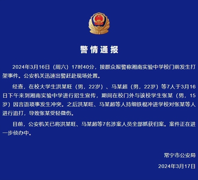 ·多人持棍沖進(jìn)學(xué)校追打中學(xué)生,湖南常寧警方通報:7名涉案人員已全部抓獲歸案。