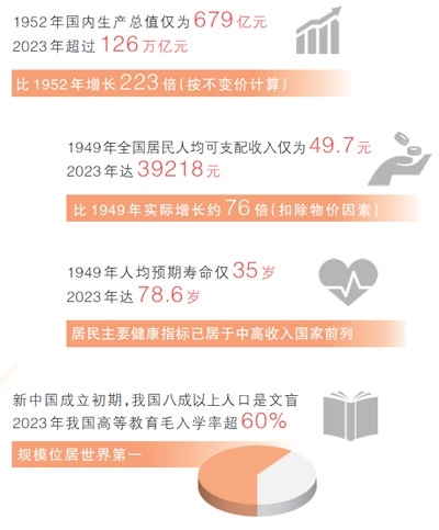 各行各業(yè)的發(fā)展成就,人民生活的蒸蒸日上,濃縮在一組組數(shù)據(jù)中。與新中國(guó)成立初期相比,2023年國(guó)內(nèi)生產(chǎn)總值增長(zhǎng)223倍、人均GDP增長(zhǎng)89倍、人均預(yù)期壽命提高43.6歲、農(nóng)村貧困人口全部脫貧……國(guó)家統(tǒng)計(jì)局近日發(fā)布新中國(guó)成立75年經(jīng)濟(jì)社會(huì)發(fā)展成就系列報(bào)告,“數(shù)”說(shuō)75年偉大成就,本版“大數(shù)據(jù)觀察”欄目推出特別報(bào)道,記錄同心同德、艱苦奮斗的奮進(jìn)歷程,匯聚共襄強(qiáng)國(guó)建設(shè)、民族復(fù)興偉業(yè)的磅礴力量。