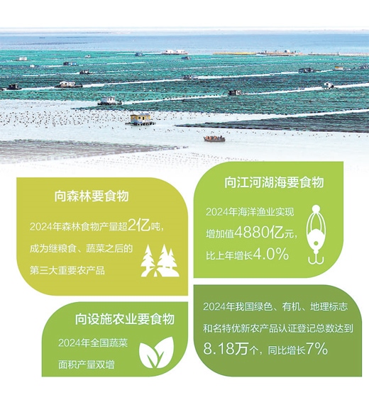 向森林要食物,2024年森林食物產(chǎn)量超2億噸,成為繼糧食、蔬菜之后的第三大重要農(nóng)產(chǎn)品。向江河湖海要食物,2024年海洋漁業(yè)實(shí)現(xiàn)增加值4880億元,比上年增長(zhǎng)4.0%。向設(shè)施農(nóng)業(yè)要食物,2024年全國(guó)蔬菜面積產(chǎn)量雙增。