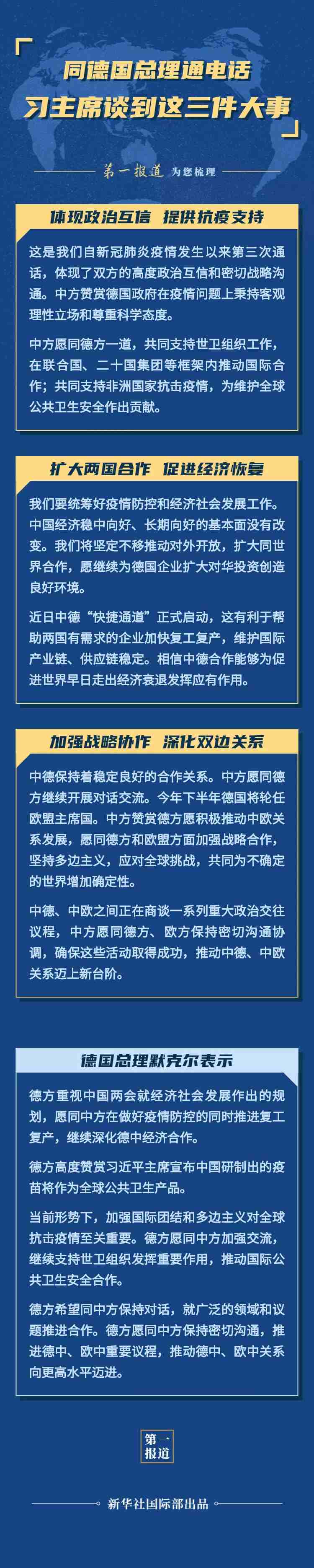 這是自新冠肺炎疫情發(fā)生以來(lái),習(xí)主席同默克爾總理第三次通話。通話信息豐富,“第一報(bào)道”為您梳理——