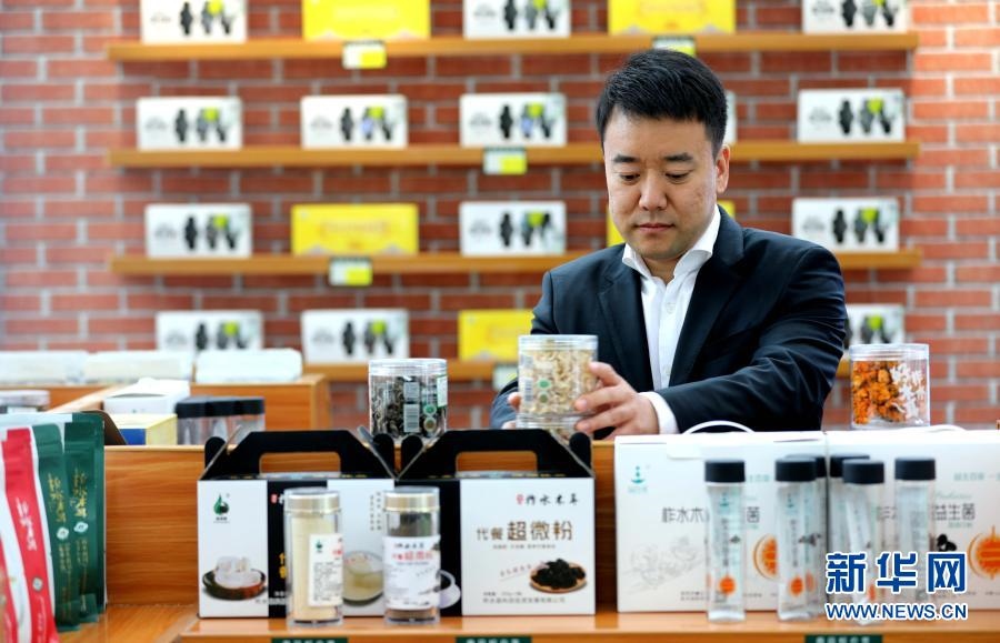 2020年4月21日,秦嶺天下電子商務(wù)有限公司總經(jīng)理趙少康在金米村培訓(xùn)中心整理貨架。新華社記者 梁愛(ài)平 攝