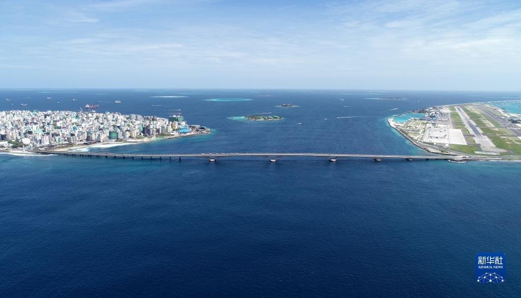 這是2019年8月30日在馬爾代夫航拍的連接首都馬累和機場島的中馬友誼大橋。新華社發(fā)(王明亮攝)