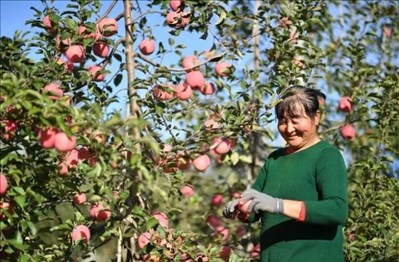 2022年10月,在陜西延安南溝村果園,習近平總書記同老鄉(xiāng)們親切交流,并采摘了一個紅紅的大蘋果。