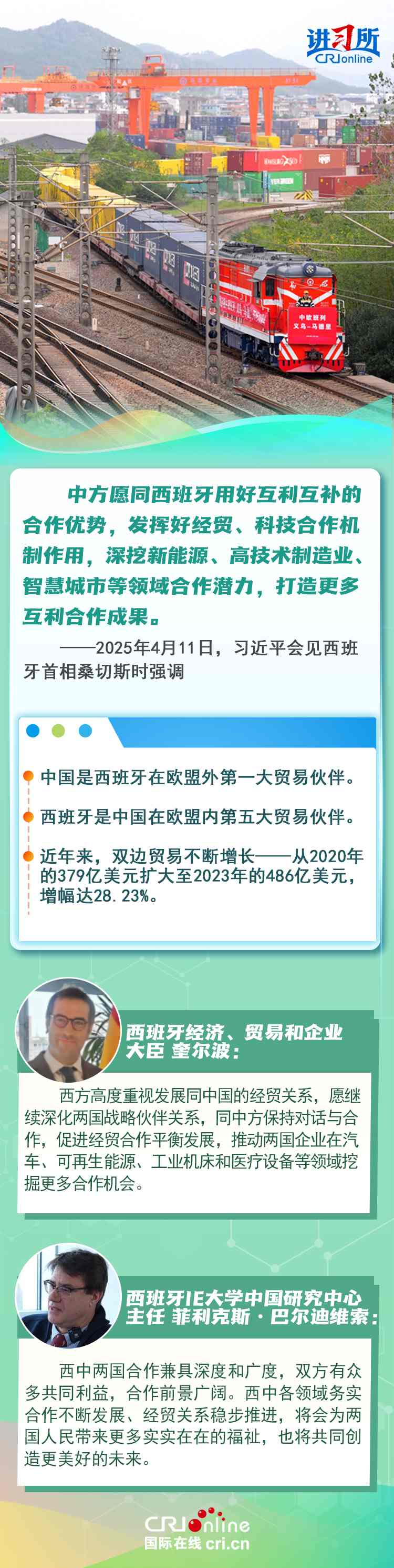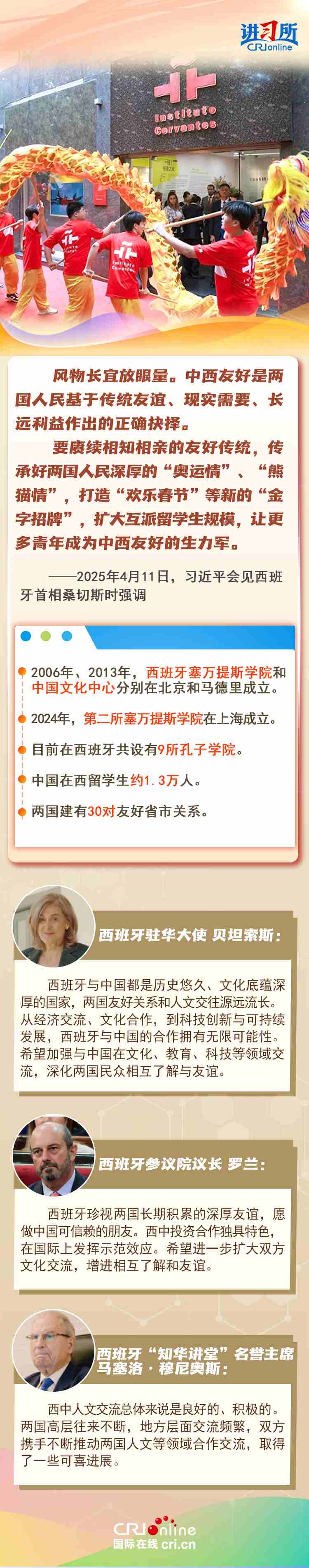 今年是中西全面戰(zhàn)略伙伴關(guān)系建立20周年,也是中歐建交50周年。多年來,中西兩國領(lǐng)導(dǎo)人保持密切互動,秉持互尊互信、互利共贏精神,兩國在深化貿(mào)易、投資、科技創(chuàng)新、綠色能源等領(lǐng)域取得豐富合作成果,雙邊關(guān)系走在中國同歐洲國家關(guān)系前列。在西班牙人士眼中,良好的對華關(guān)系對西班牙、歐洲和世界具有重要意義,將會為兩國人民帶來更多實(shí)實(shí)在在的福祉,也將共同創(chuàng)造更美好的未來。