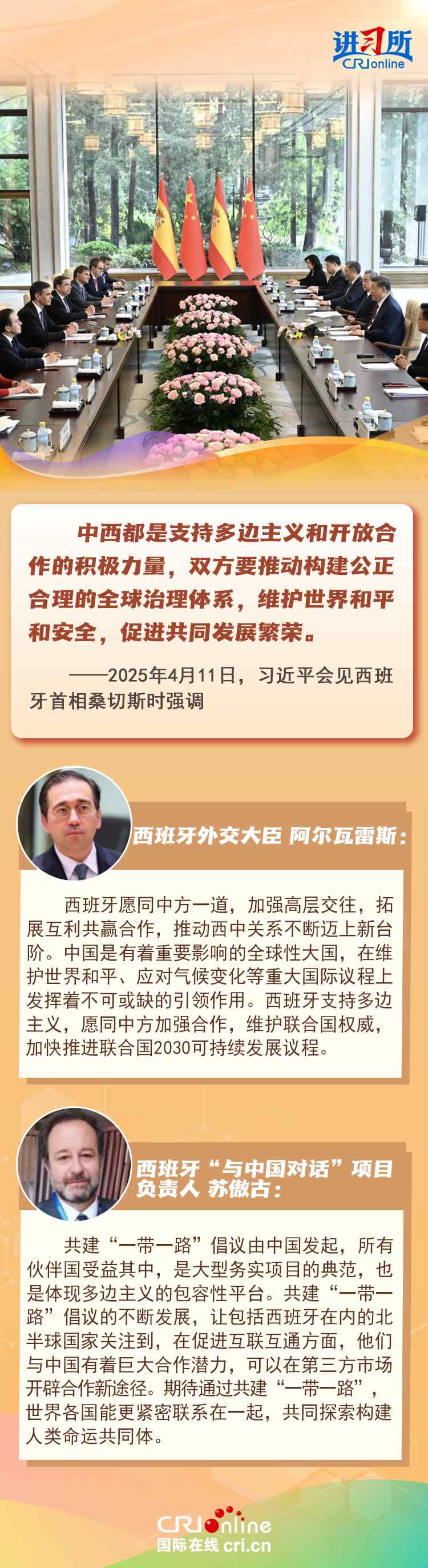 4月11日,中國國家主席習(xí)近平在北京會見來華訪問的西班牙首相桑切斯時表示,中西友好是兩國人民基于傳統(tǒng)友誼、現(xiàn)實(shí)需要、長遠(yuǎn)利益作出的正確抉擇,中西都是支持多邊主義和開放合作的積極力量,雙方要推動構(gòu)建公正合理的全球治理體系,維護(hù)世界和平和安全,促進(jìn)共同發(fā)展繁榮。