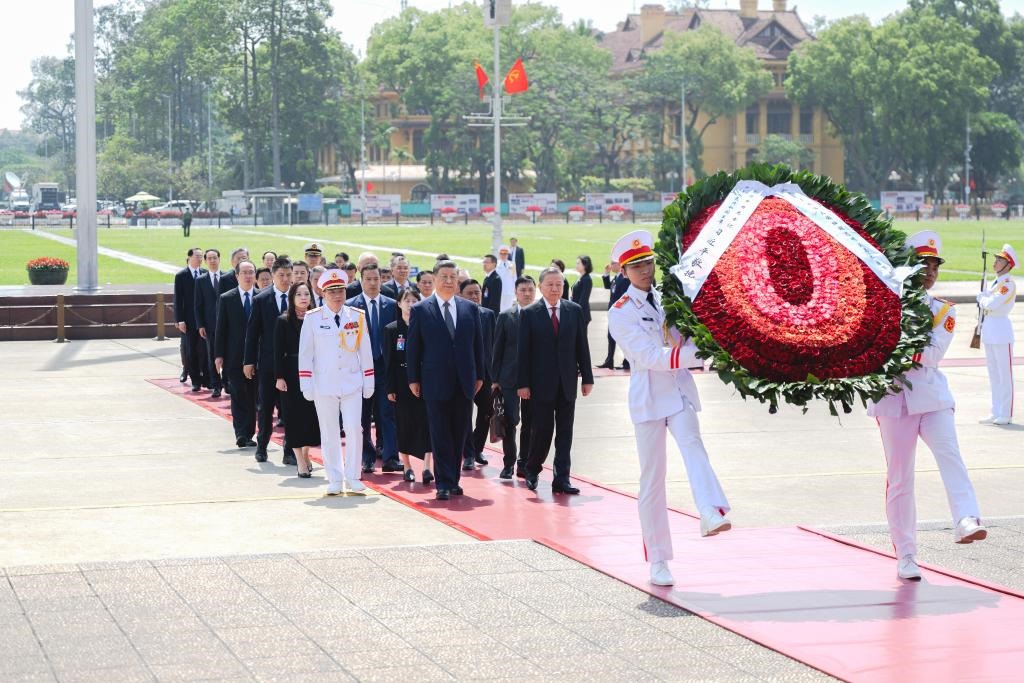 15日上午,在蘇林陪同下,習(xí)近平瞻仰胡志明陵并敬獻(xiàn)花圈。