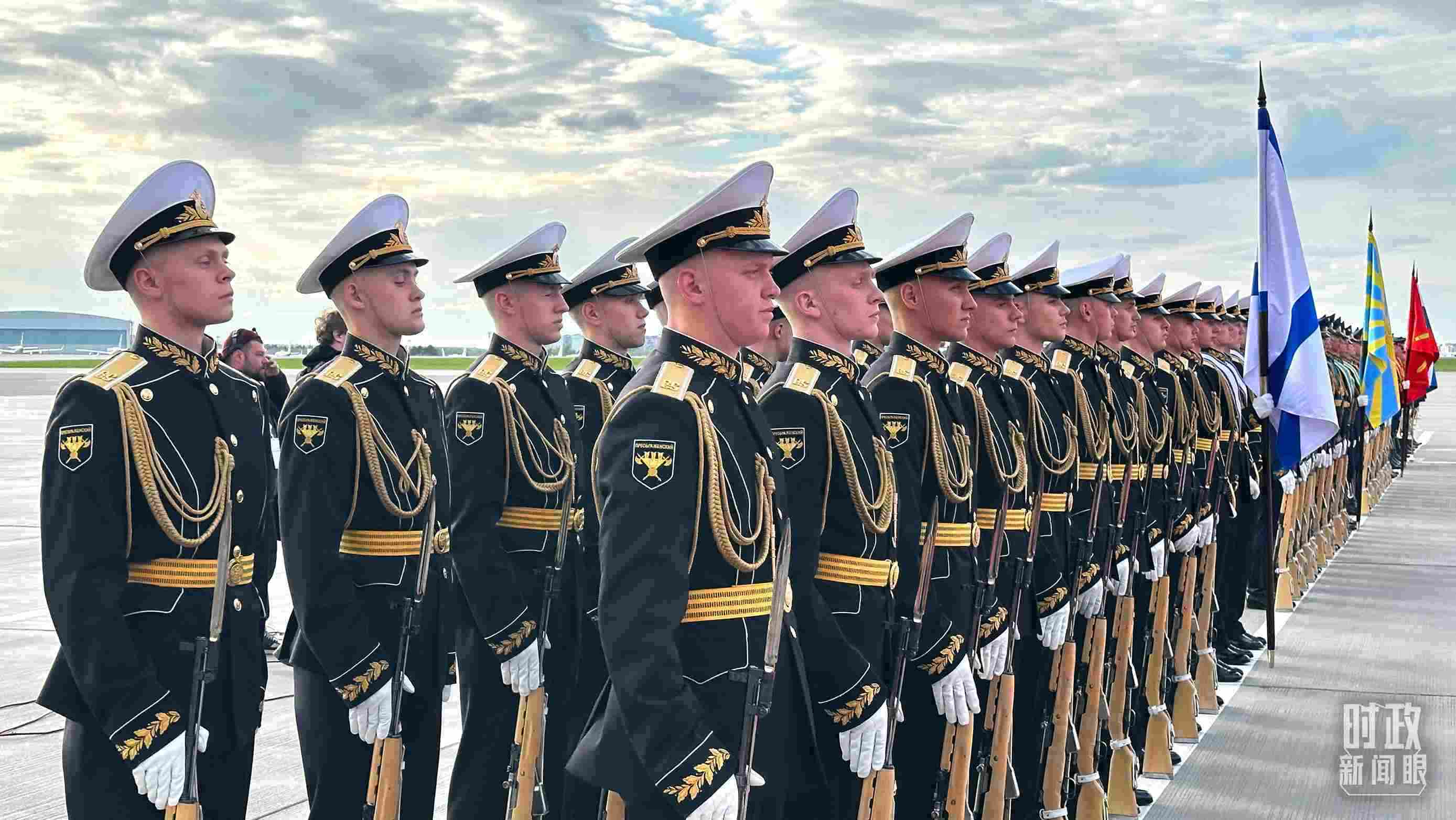 俄方在機場舉行隆重迎接儀式。軍樂團奏中俄兩國國歌。習(xí)主席檢閱儀仗隊并觀看分列式。