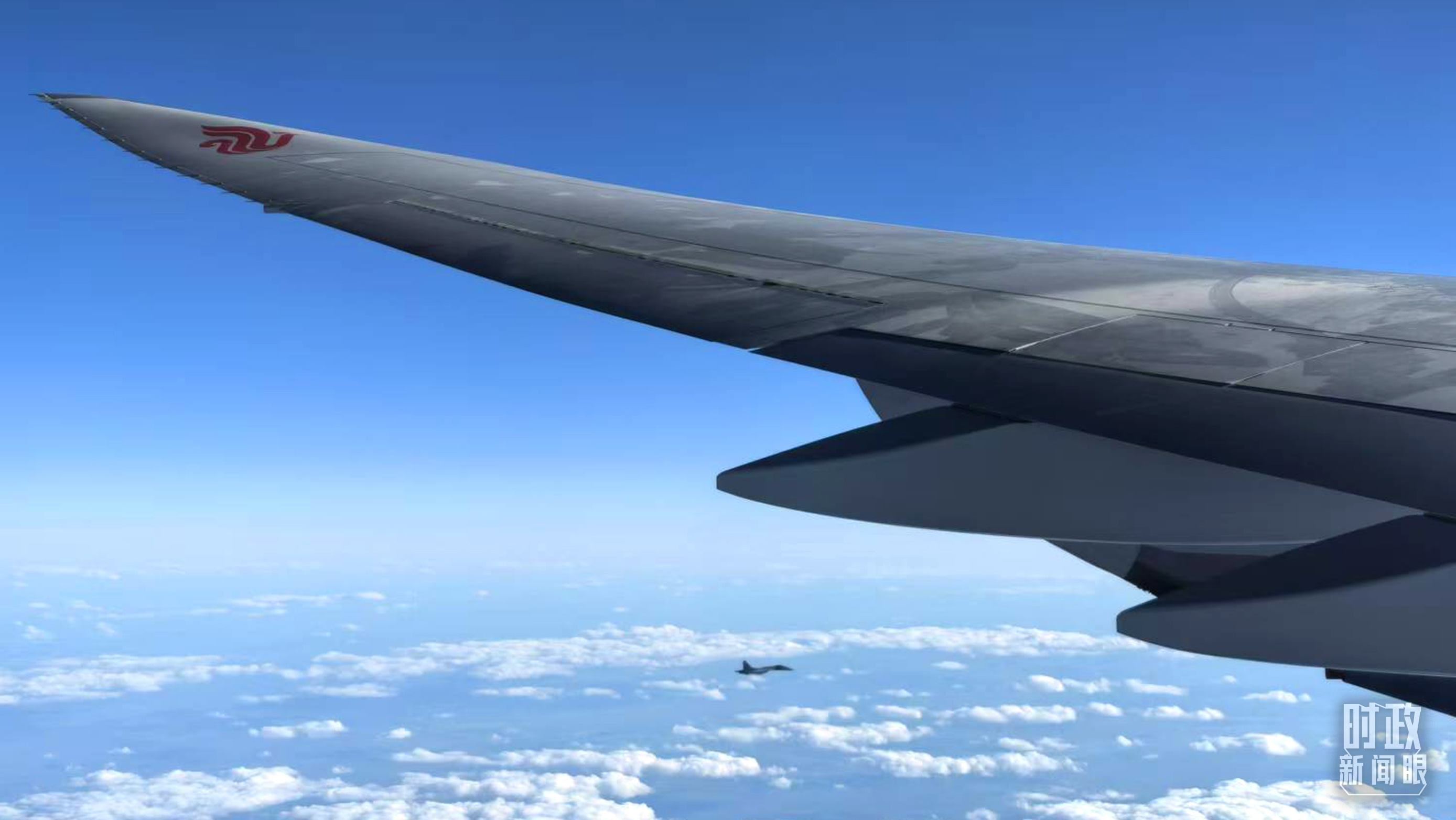 △俄羅斯戰(zhàn)機升空護航。(總臺央視記者李錚拍攝)