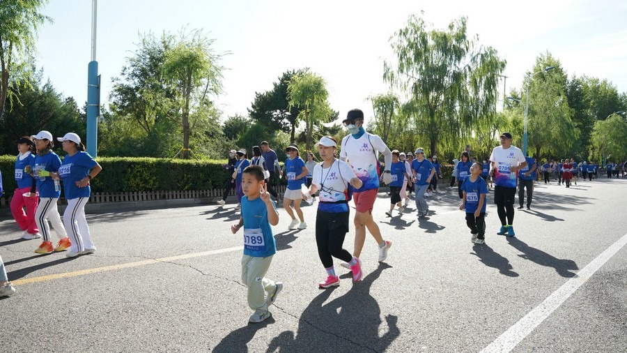 上午8時整,勞動公園彩旗飄揚,1400名青城跑者聚集在此,隨著清脆的笛鳴響起,身著藍(lán)色運動服的青城跑者們奔跑在陽光照射下的步道上,沿途盡賞青城美景,盡享運動健身之樂。