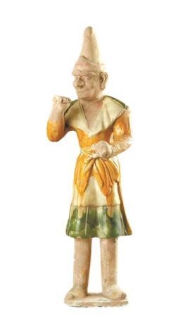 展覽中的“黃綠釉執(zhí)壺胡俑”與廣州博物館收藏的兩件胡俑非常類似。廣州博物館藏的那對胡人俑一個為中國國家博物館移交,另一個為舊藏。這三件來源各異的俑均高約28.5厘米,頭戴氈帽,鼻子高高隆起,呈鷹鉤狀,上唇有八字分開的胡須,胡子尾部上翹,臉部有濃密的絡(luò)腮胡;身著圓領(lǐng)窄袖的衣服,腰間束帶,下身著褲,腳套皮靴,雙腿并立站在方形小臺上,一手平放在胸前,一手下垂到腹部前,提著一個帶流的長頸瓶子。有學(xué)者指出,他們是走街串巷做買賣的小胡商,手持的執(zhí)壺稱為“胡瓶”,可能是供自己行商途中喝水之用,亦有可能是叫賣的物品。