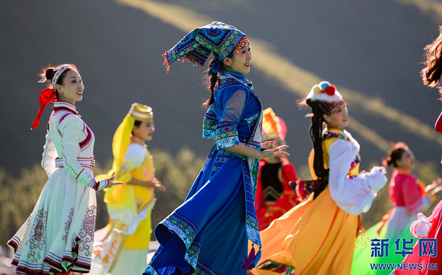 8月8日,烏蘭牧騎隊員們在開幕式上進行文藝表演。新華網(wǎng)發(fā)(丁根厚攝)