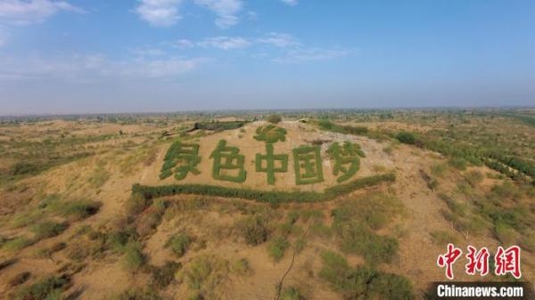圖為寫有“綠色中國夢(mèng)”字樣的庫布其沙漠。 張博供圖