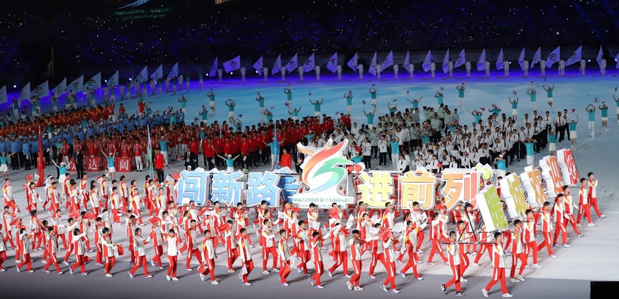 開幕式現(xiàn)場(chǎng)座無虛席,萬眾矚目下儀仗隊(duì)護(hù)送五星紅旗步入會(huì)場(chǎng),國(guó)旗莊嚴(yán),腳步鏗鏘,一種豪邁和驕傲激蕩在每個(gè)人的心里。