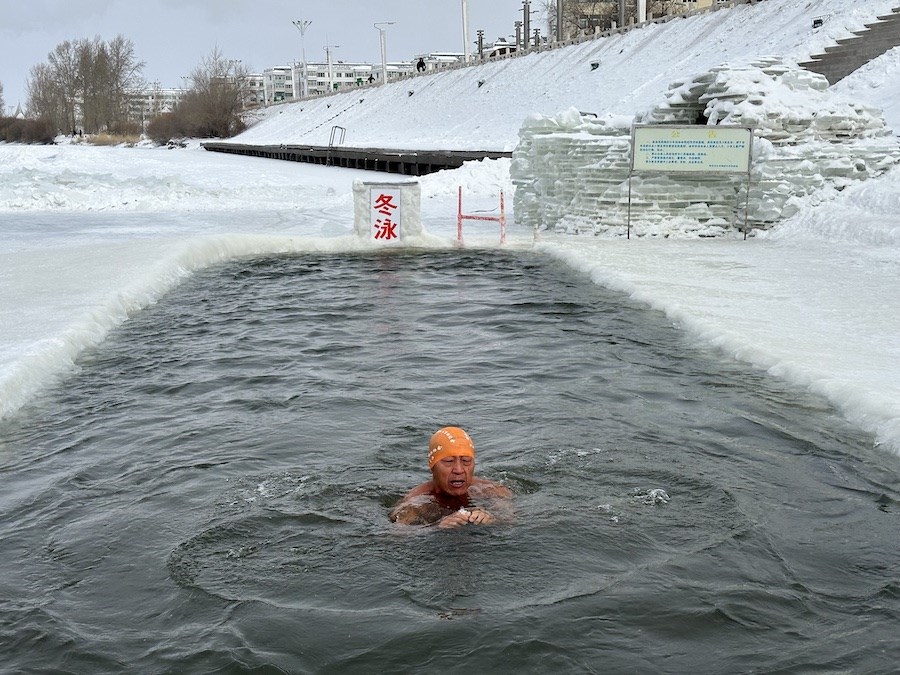 參加冬泳的協(xié)會成員只著泳衣,依次跳入在伊敏河冰面開鑿的冬泳池中,雖然天寒地凍,但是依然精神抖擻。