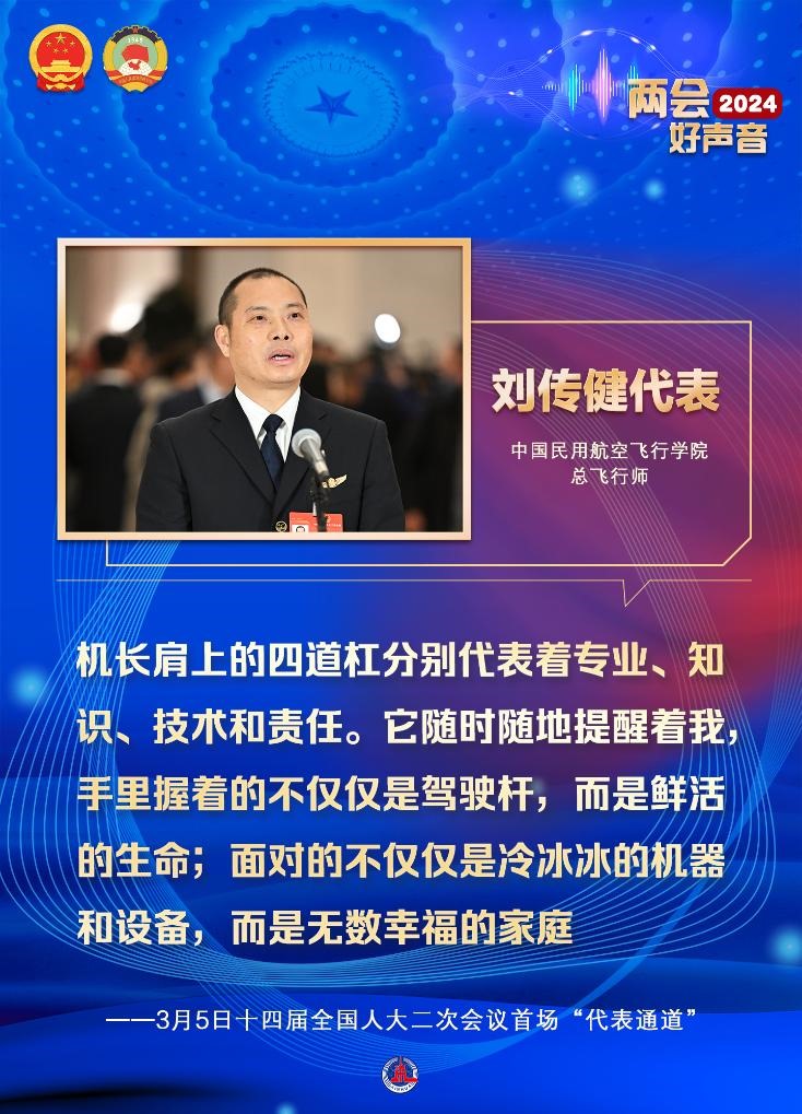 劉傳健說:“機長肩上的四道杠分別代表著專業(yè)、知識、技術和責任。它隨時隨地提醒著我,手里握著的不僅僅是駕駛桿,而是鮮活的生命;面對的不僅僅是冷冰冰的機器和設備,而是無數(shù)幸福的家庭?!?/p>