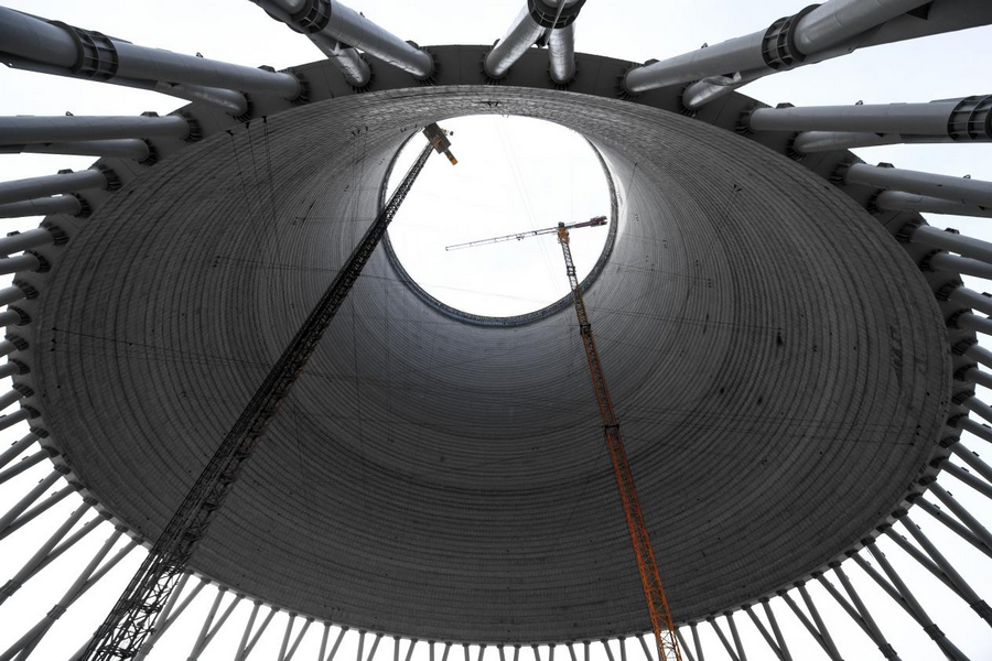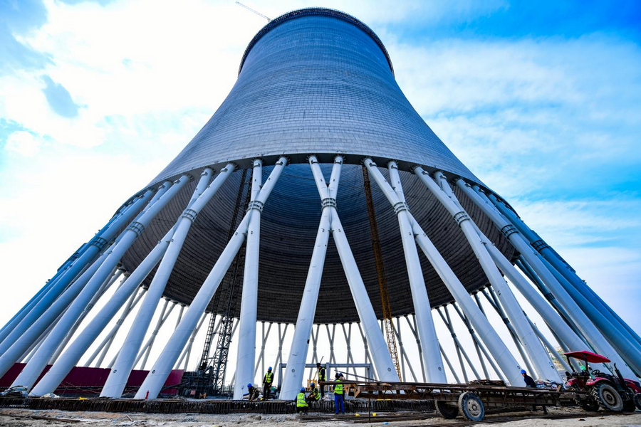 12月6日,在內(nèi)蒙古呼和浩特市土默特左旗內(nèi)蒙古能源集團金山熱電三期項目建設(shè)現(xiàn)場,工人們正有序進(jìn)行著設(shè)備安裝等工作。進(jìn)入該項目間冷塔內(nèi)部,抬頭仰望,仿佛一只巨大的眼睛凝視,未來該項目投產(chǎn)后可實現(xiàn)年發(fā)電量100億千瓦時,新增供熱面積5000萬平方米,將溫暖送至千家萬戶。(楊鑫 攝)