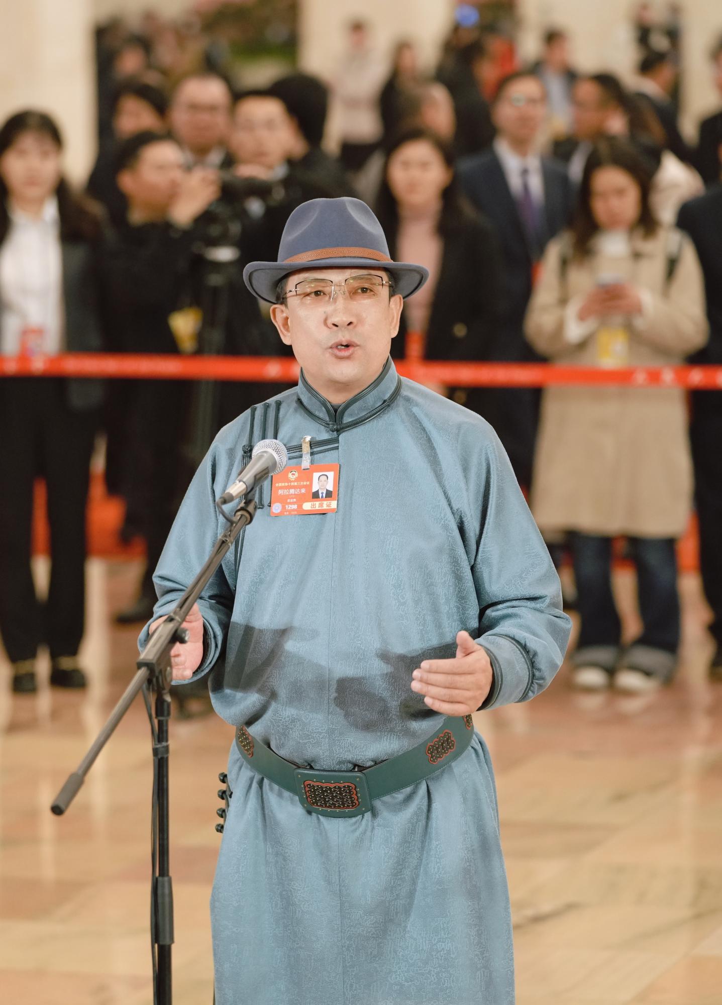 3月10日,全國政協(xié)十四屆三次會(huì)議第三場“委員通道”集體采訪活動(dòng)在北京人民大會(huì)堂舉行。住內(nèi)蒙古全國政協(xié)委員阿拉騰達(dá)來接受媒體采訪。草原云記者 王鵬 攝