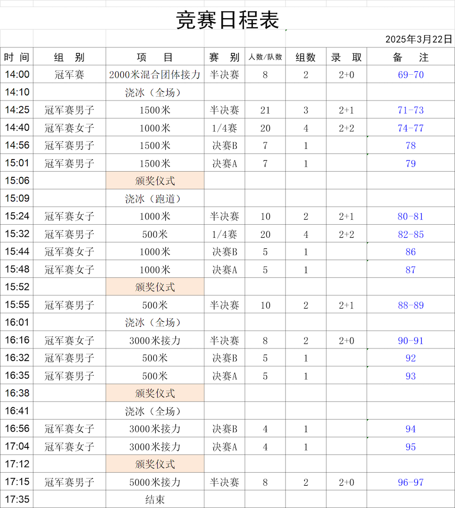 比賽項(xiàng)目包括男女500米、1000米、1500米以及接力賽等多個(gè)項(xiàng)目。
