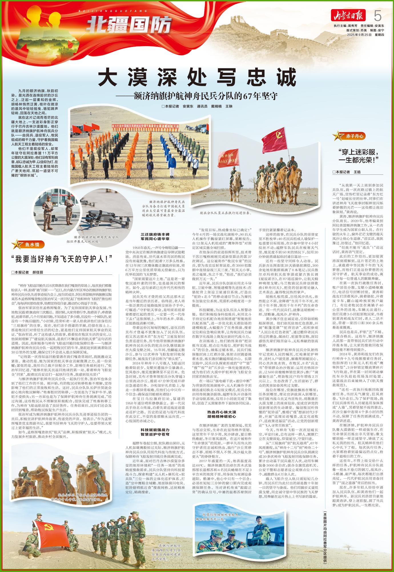 額濟(jì)納旗護(hù)航神舟民兵分隊始終牢記黨和人民的囑托,扛槍乘駝護(hù)神舟、進(jìn)村入戶頌黨恩、解難幫困暖民心、同心共沐魚水情。在牧區(qū),8名“兵支書”帶領(lǐng)群眾治沙致富:運(yùn)用方格固沙法,讓500畝梭梭林鎖住黃沙;推廣“滴灌催生法”,幫助牧民戶均年增收2萬元以上。生態(tài)改善了,生活富裕了,群眾的笑容如春風(fēng)吹過戈壁。