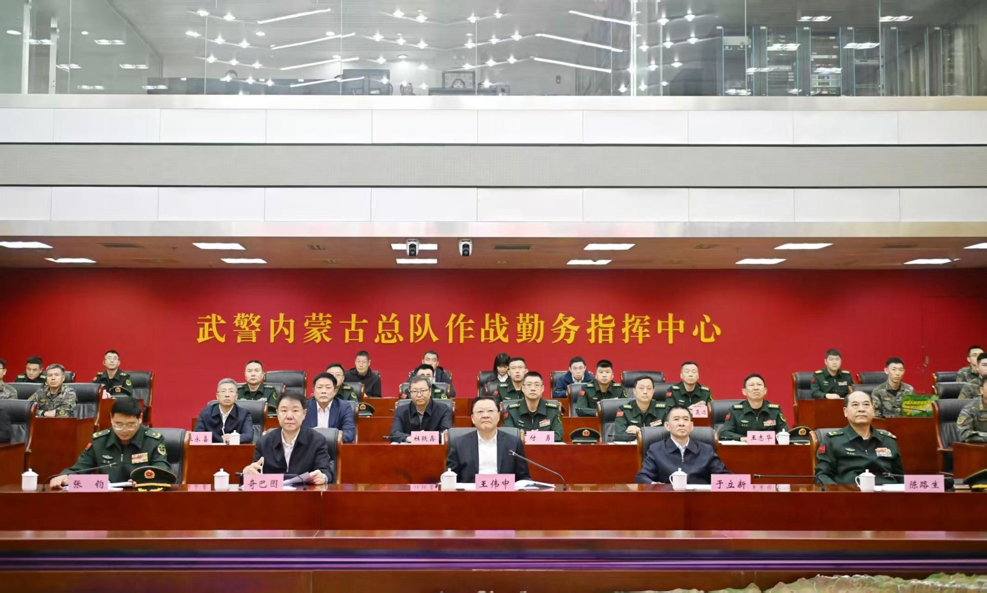在武警內(nèi)蒙古總隊(duì),王偉中來到作戰(zhàn)勤務(wù)指揮中心,仔細(xì)聽取部隊(duì)建設(shè)和指揮中心運(yùn)行情況介紹。他指出,武警內(nèi)蒙古總隊(duì)是一支有著光榮歷史的英雄部隊(duì),希望部隊(duì)繼續(xù)關(guān)心支持自治區(qū)經(jīng)濟(jì)社會發(fā)展,加強(qiáng)練兵備戰(zhàn),做好應(yīng)急準(zhǔn)備,當(dāng)好內(nèi)蒙古高質(zhì)量發(fā)展和長治久安的堅(jiān)強(qiáng)基石、忠誠衛(wèi)士,為全區(qū)社會大局穩(wěn)定和人民群眾安居樂業(yè)保駕護(hù)航。