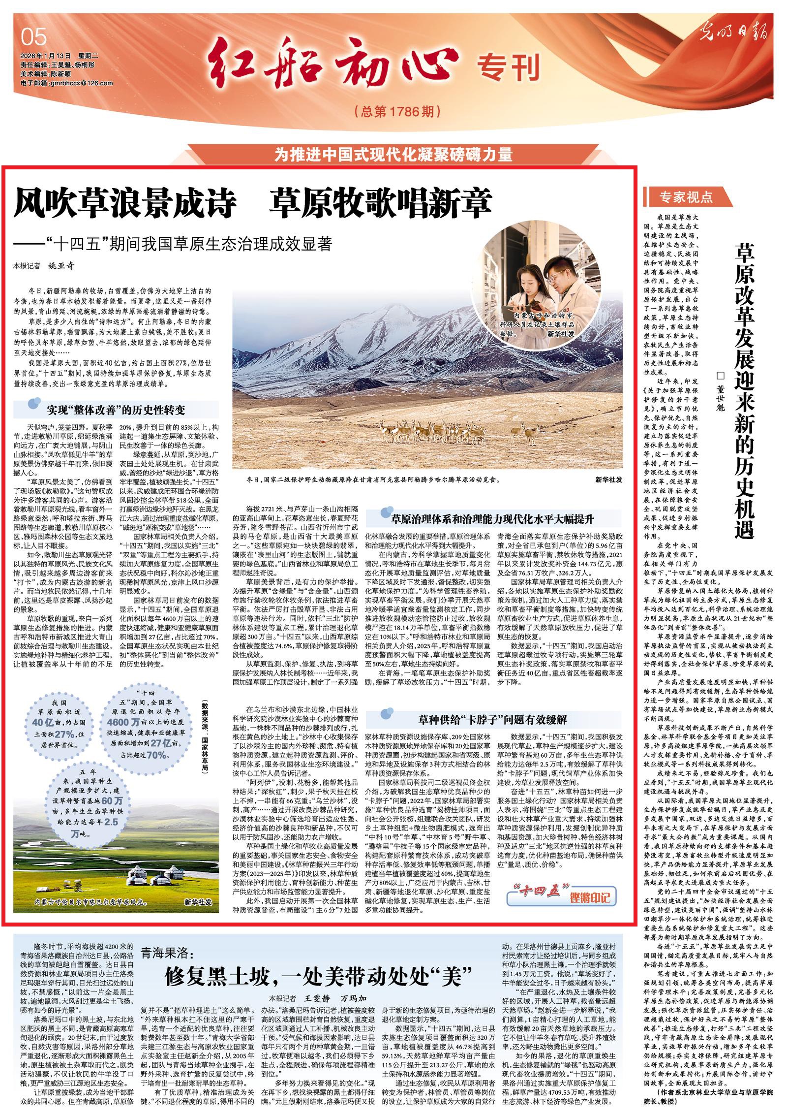 2026年1月13日,《光明日報》5版刊發(fā)題為《風(fēng)吹草浪景成詩 草原牧歌唱新章——“十四五”期間我國草原生態(tài)治理成效顯著》的文章,報道了“十四五”期間,我國持續(xù)加強(qiáng)草原保護(hù)修復(fù),草原生態(tài)質(zhì)量持續(xù)改善,交出一張綠意充盈的草原治理成績單。