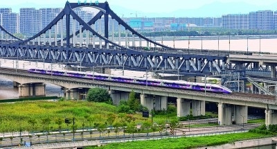 10月3日,亞運(yùn)涂裝復(fù)興號智能動車組從杭州東站發(fā)出,穿過錢塘江。本報記者 陳城攝/光明圖片