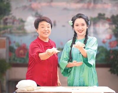 柳青瑤(右)身穿綠色老軟緞改良旗袍與煙臺(tái)市膠東花餑餑非遺傳承人曲麗榮錄制電視節(jié)目。本文配圖除標(biāo)注外均為受訪(fǎng)者供圖