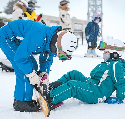 在黑龍江省哈爾濱市亞布力滑雪旅游度假區(qū),一名小滑雪愛(ài)好者(右)在大人的幫助下穿上雪板。