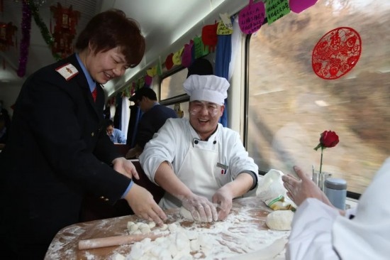 2013年除夕,北京西開往成都的列車上,鐵路職工包餃子迎新春。