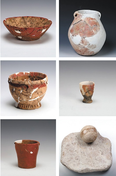 外圍人工土臺一般用純凈的黃褐色黏土堆筑而成,大多呈東西向的長方形。土臺上目前已揭露房址2處、灰坑23座、器物坑28座、高等級墓葬3座。墓葬的墓坑呈長方形,東西向或南北向。隨葬陶器較多,均在20件以上,主要有平底罐、圈足罐、大口盆等,有的墓葬還隨葬石器。從隨葬品的數(shù)量看,等級較高,說明在稻作農(nóng)業(yè)經(jīng)濟(jì)的支撐下,距今9000年左右,上山文化社會(huì)較早地出現(xiàn)了社會(huì)分化。