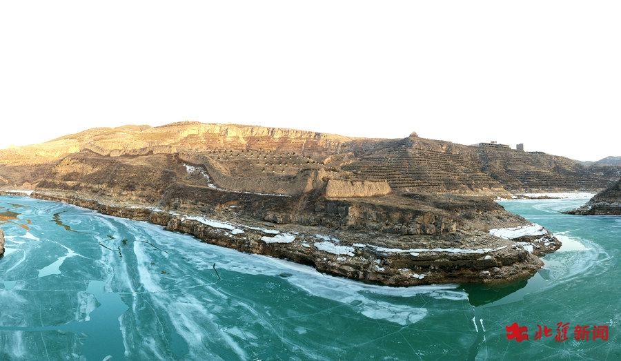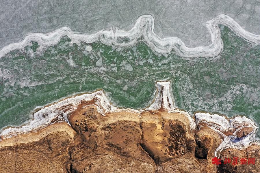 3月14日,黃河呼和浩特段部分河段已出現(xiàn)開河跡象,汩汩水流在冰面上流淌。而在太極灣和老牛灣段,黃河冰面碧綠如玉,空中俯瞰相當壯觀。